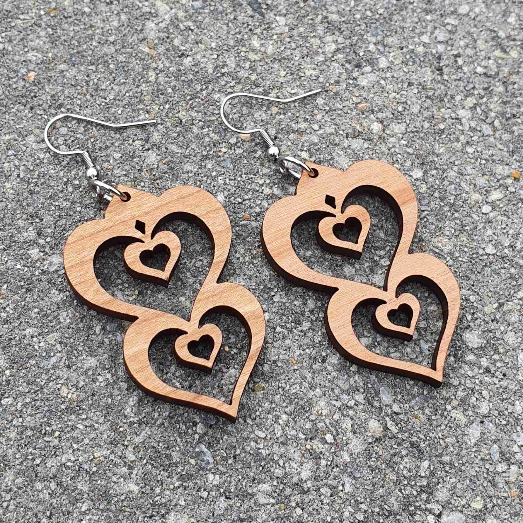 Ett par söta örhängen med hjärtan av trä och örkrok av kirurgiskt stål. (Rostfrittstål 316 nickelsäkert enligt EU:s direktiv.)